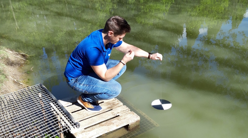 Simple, fast and economical, the Secchi disk method is used to evaluate the vertical depth of light penetration in water. The principle of the method is to determine the depth at which a white disc becomes invisible to the eye (known as the "Secchi depth"). Our sampling technicians are trained and qualified to carry out this method.